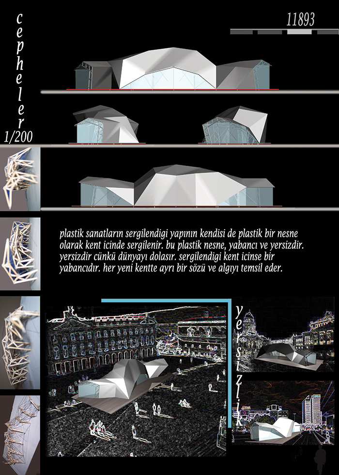 Projemizin temel düşüncesi; bir sergileme mekânı olmanın yanı sıra, yapının kendisinin de plastik bir nesne olarak sergilenmesidir. Bu plastik nesne, yabancı ve yersizdir: yersizdir, çünkü dünyayı dolaşır. Sergilendiği kent içinse bir yabancıdır.