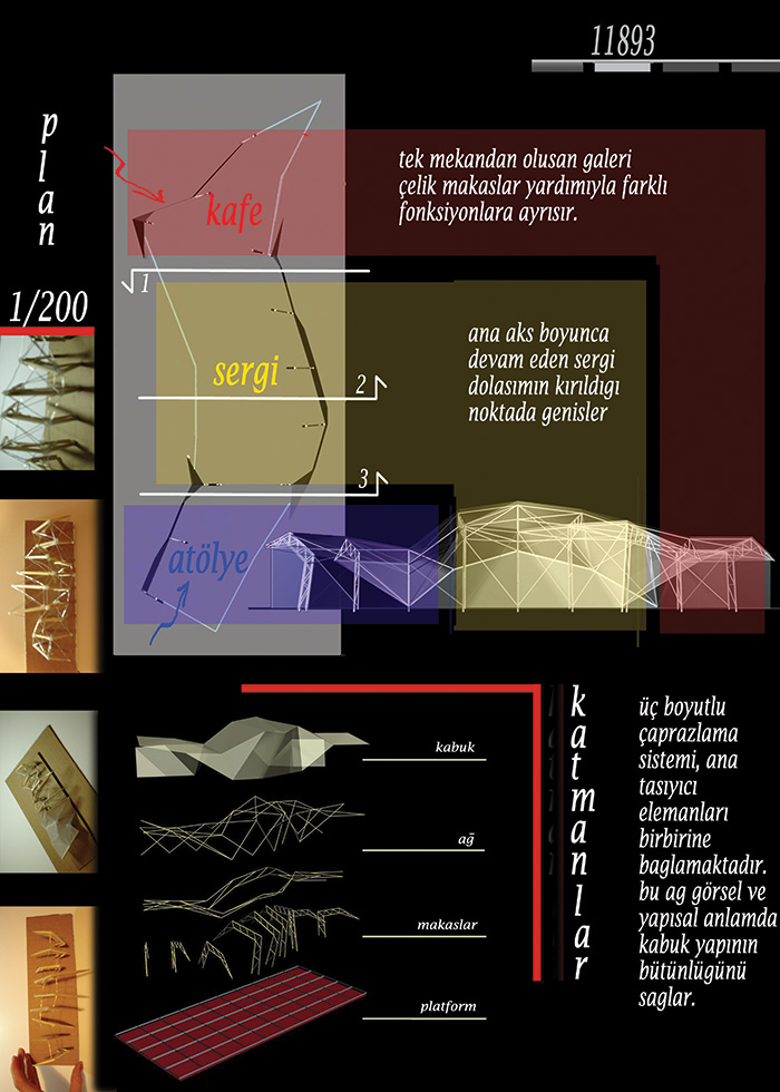 Projemizdeki ana taşıyıcı elemanlar; 2 eklemli çelik makaslardır. İki tip çelik makas kullanılmıştır. Bu elemanlar; gridal bir düzende, sistematik bir açılanma göstererek platforma yerleşirler ve kabuk yapıyı tanımlarlar. Makas elemanlar, yönlenmeleri ve kesit özellikleri ile mekânların birbirinden ayrışmasını sağlar. Diğer bir deyişle, farklı fonksiyona sahip hacimler, bölüntülerle değil; ışık aldıkları yöne ve makas boyutlarına göre farklılaşır. Bu amaçla, kafe ve atölyelerde küçük, ana sergi mekânında büyük makaslar kullanılmıştır. üçboyutlu çaprazlama sistemi, ana taşıyıcı elamanları birbirlerine bağlamaktadır. Bu “çaprazlama ağı” görsel ve yapısal anlamda kabuk yapının bütünlüğünü sağlamaktadır. Yapı içinde yaratılan hacimsel değişiklikler insan hareketini yönlendirir ve bireyin mekân algısını şekillendirir. Çeliğin estetiğinin ve esnekliğinin yansımasını amaçladığımız yapı, gittiği kentin değişen yüzünde geçici varlığı ile kendi sözünü söyler.