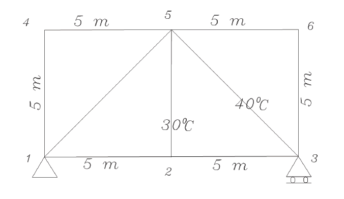 Yukarıdaki kafes sistemin 2-5 ve 3-5 elemanları sırası ile; ΔT; 30C ve 40C sıcaklığa kadar ısıtıldığında 5 noktasında oluşacak düşey deplasman değeri aşağıdakilerden hangisidir?