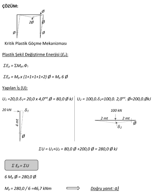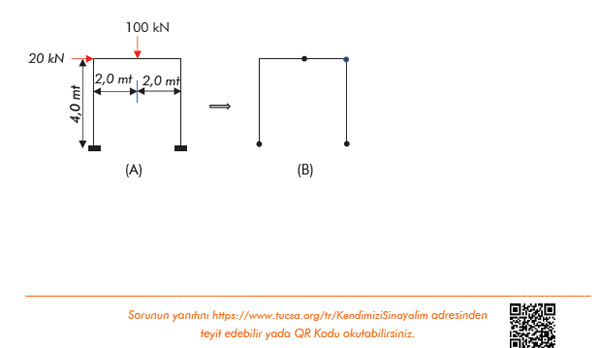 Aşağıdaki çerçeve elemanlarının tümü aynı plastik moment kapasitesine sahiptir. Şekil (A)’daki yükler altında oluşabilecek, sistemin kritik göçme durumuna karşı gelen Şekil (B)’deki plastik mafsalların konumunu dikkate alarak hesaplanacak minimum gerekli “Plastik Moment” kapasitesi aşağıdakilerden hangisidir.