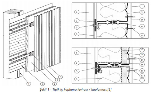 Yatay olarak yerleştirilmiş, ana çerçeve kolonları tarafından desteklenen iç kaplama levhaları ve ayrıca trapezoid veya sinüzoidal sac levhadan yapılmış dış kaplama kullanan herhangi bir kaplama sistemi, Şekil 1'de gösterildiği gibi özel bir "hücresel" yapıya sahiptir. Bu şekilde, sektörde faaliyet gösteren tanınmış bir tedarikçi tarafından verilen konfigürasyonla tipik bir iç kaplama levhası gösterilmektedir [3].