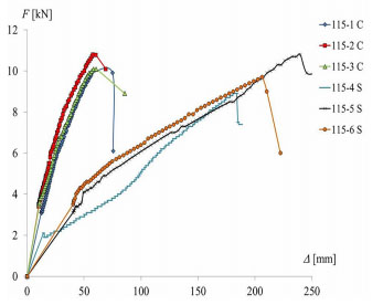 Burada, rüzgâr basıncını simüle etmek için 3 eş örnek test edildi ve diğer 3 eş örnek rüzgâr emişlerini simüle etmek için test edildi. Böylece, diyagramda toplam 6 kuvvet saptırma grafiği görünür. Aslında, şema açıklamasında, rüzgâr basıncı altında test edilen örnekler “115-1C, 115-2C ve 115-3C” olarak gösterilirken, rüzgâr emişi altında test edilen örnekler “115-4S, 115-5S ve 115-6S” olarak gösterilir. Dikey eksende nihai kaldırma kuvveti F’nin [kN] cinsinden değeri verilirken yatay eksendeki sehim ∆ [mm] cinsinden gösterilir.