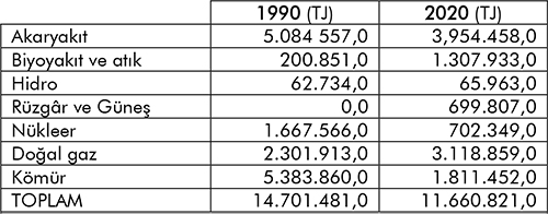 Almanya’daki enerji kaynaklarının kullanımının 1990 ile 2020 rakamları aşağıda paylaşılmıştır.