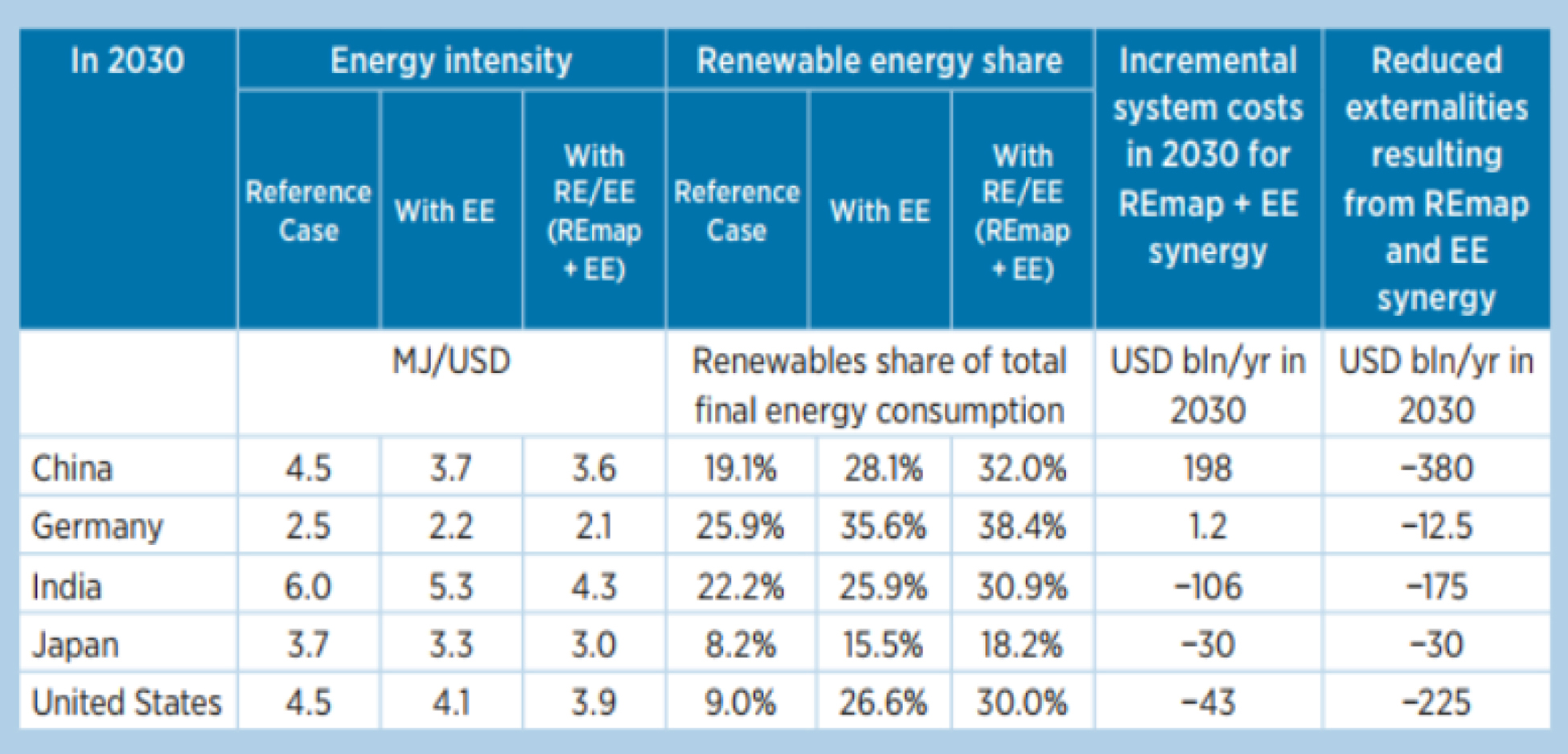 2. Tüm ülkeler, yenilenebilir enerji ve enerji verimliliği arasındaki önemli sinerjilerden faydalanabilirler. Daha fazla yenilenebilir enerji, enerji talebini azaltır ve daha yüksek enerji verimliliği de yenilenebilir enerjinin daha yüksek payı ile sonuçlanır. Bu sinerjiler, demand artışı, ülkelerin enerji demand yapısı, lokal kaynakların uygunluğu ve iklim koşullarına göre değişmektedir.